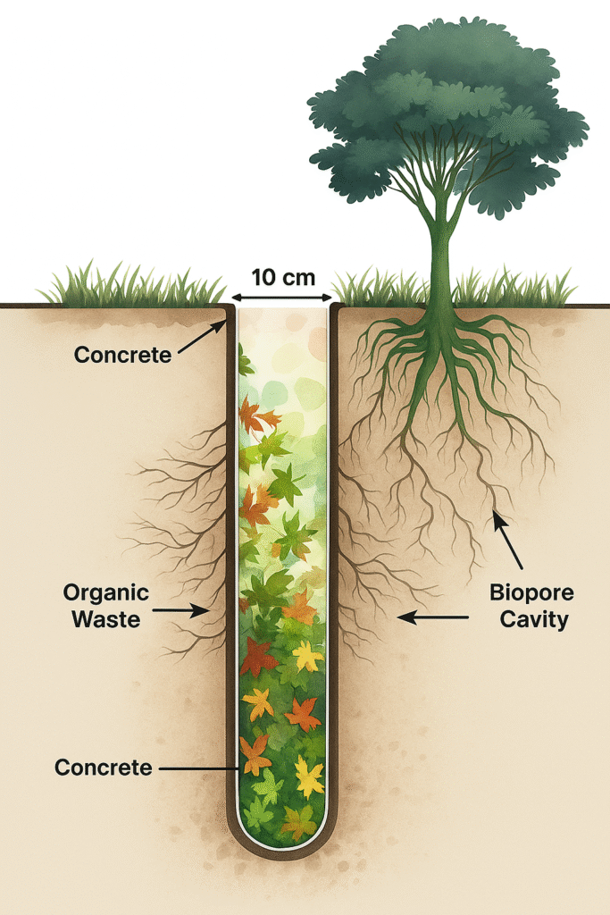 Biopori holes are narrow, vertical holes—about 10–30 cm wide and 80–100 cm deep—drilled into the soil to allow rainwater to soak into the ground rather than run off into streets and rivers. The holes are filled with organic waste like leaves or food scraps, which improve soil fertility while keeping the holes porous for water infiltration.